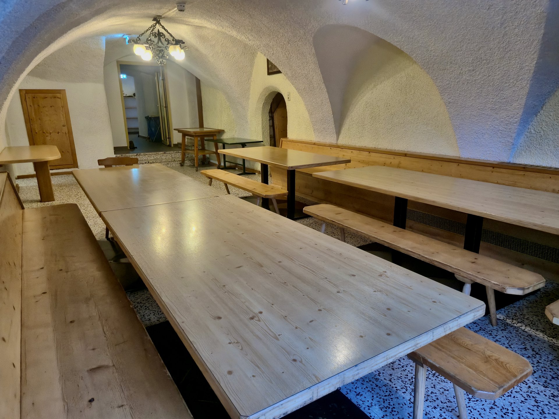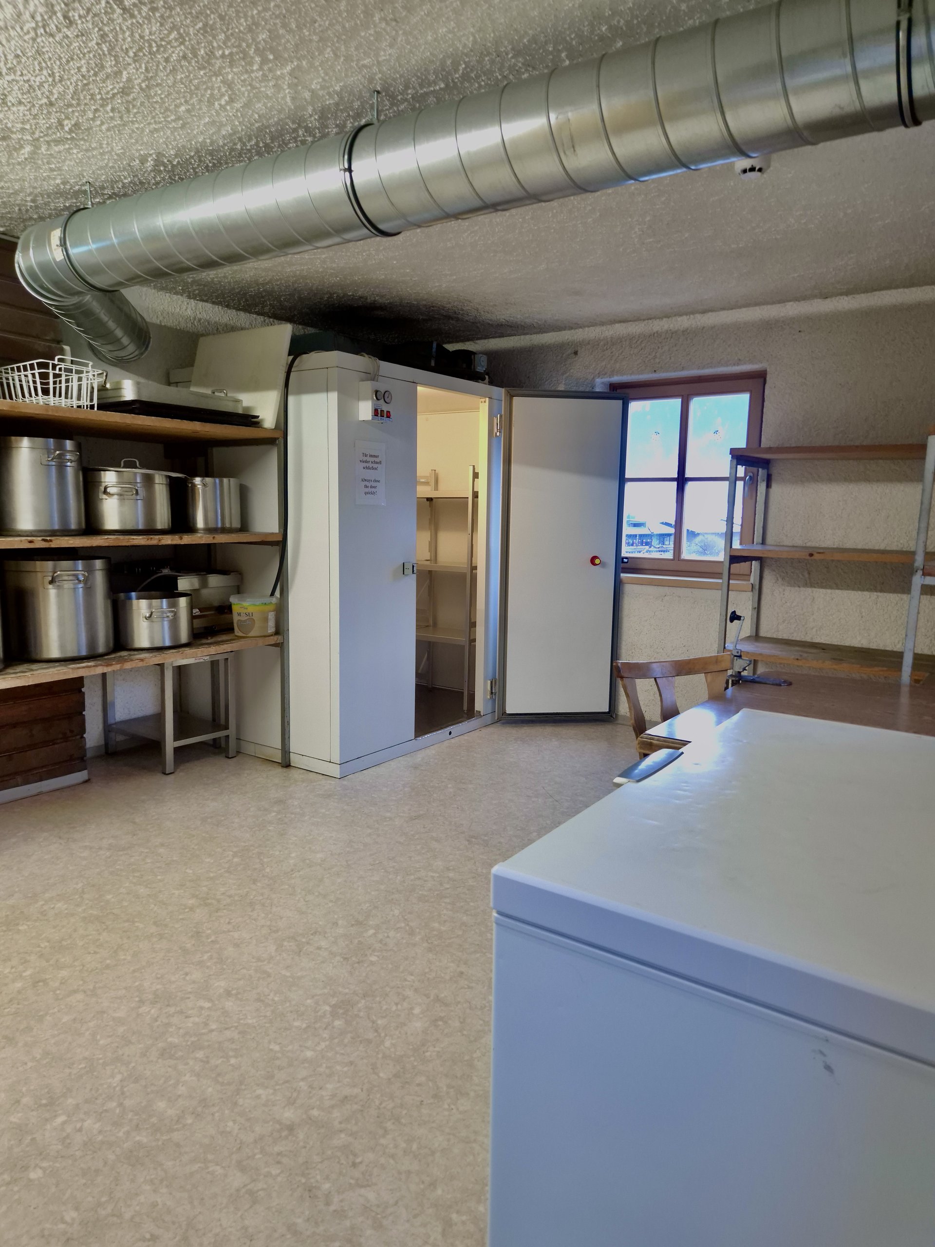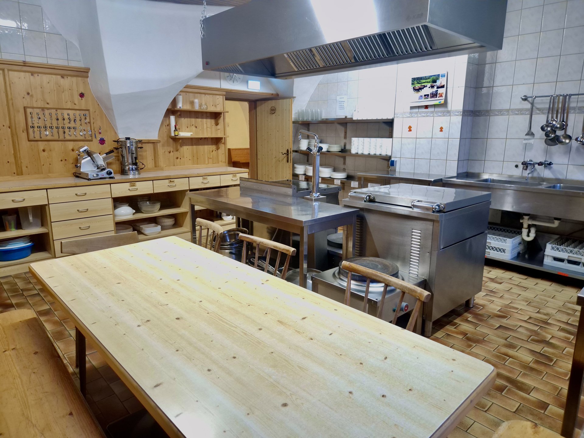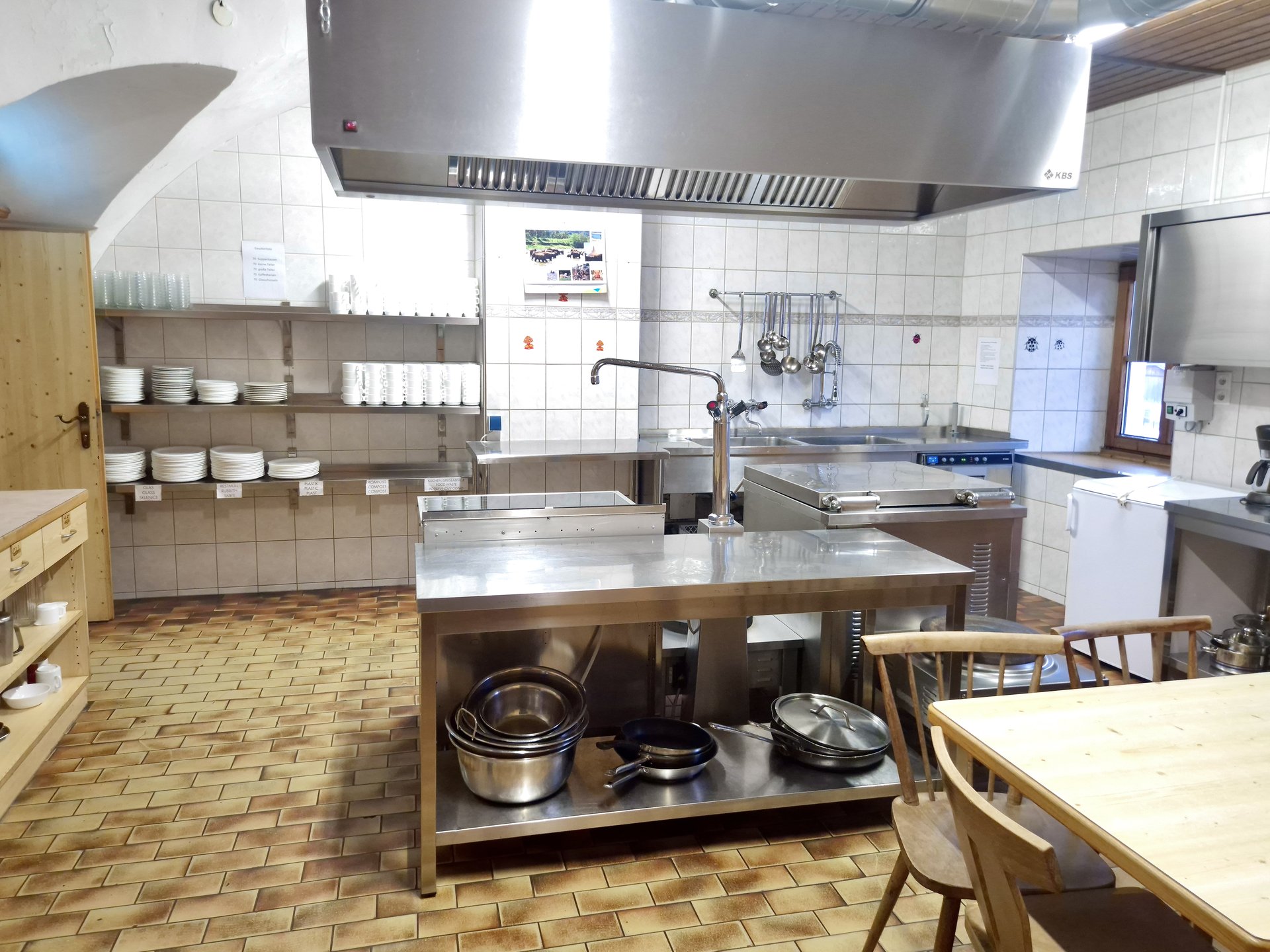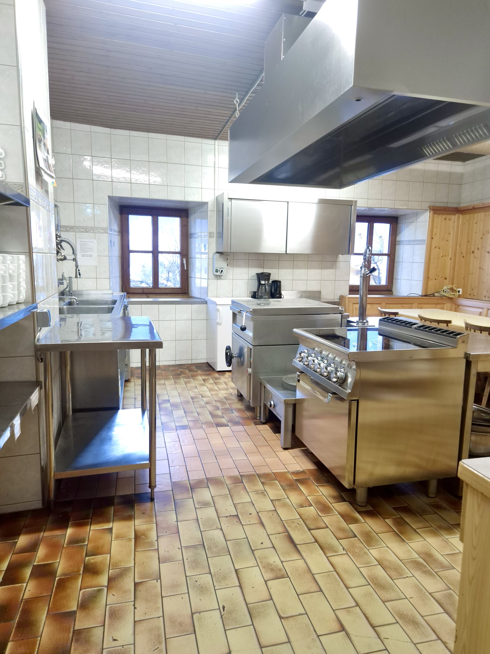The house's large commercial kitchen is ideally equipped for self-catering groups. Comprehensive kitchen equipment and ample cookware and tableware allow for the uncomplicated preparation of meals together.