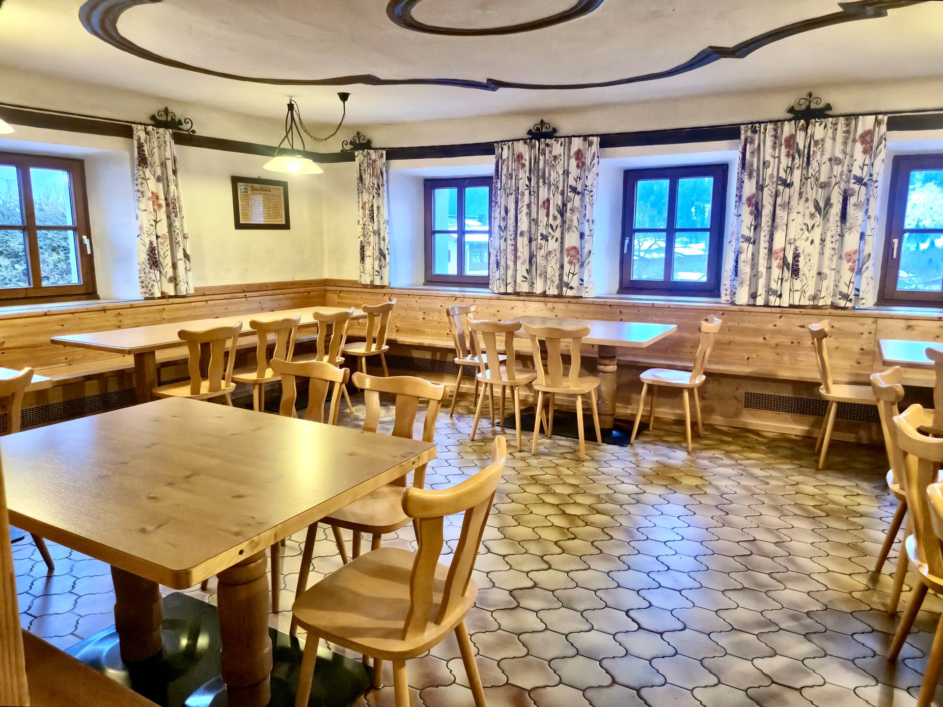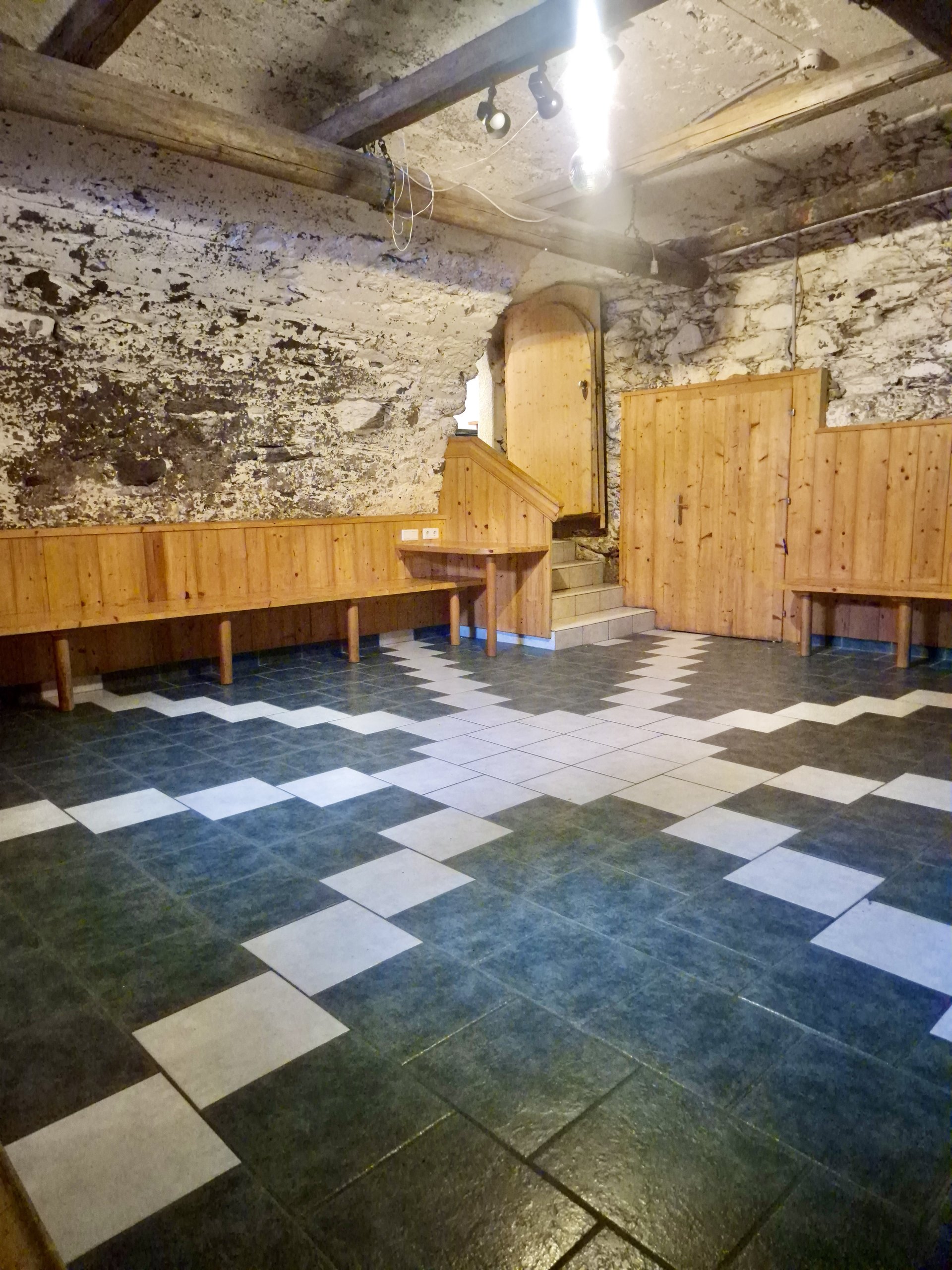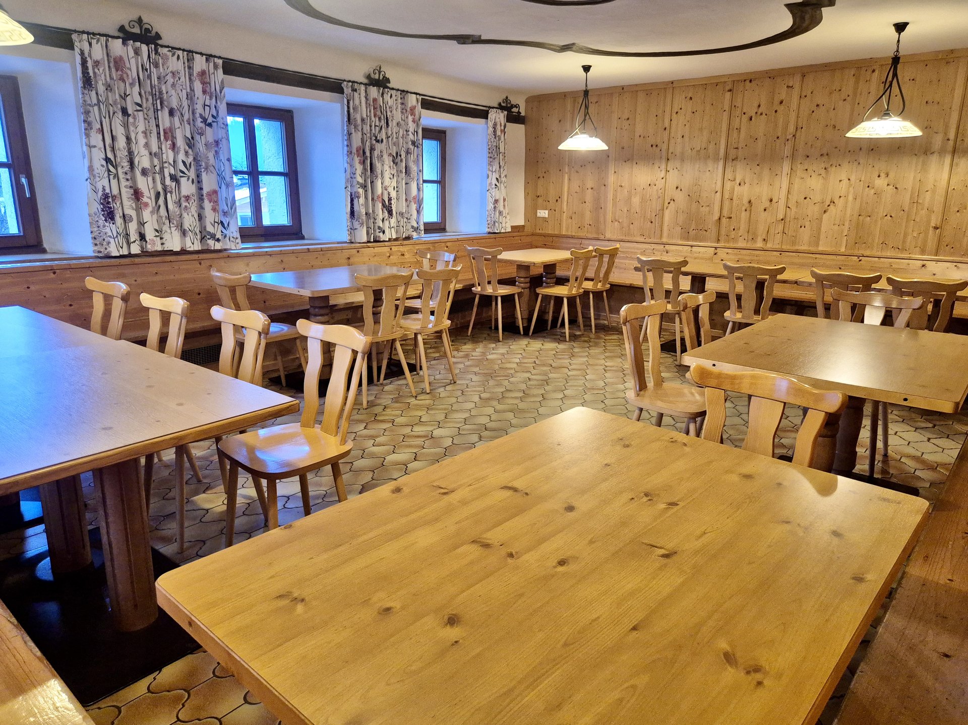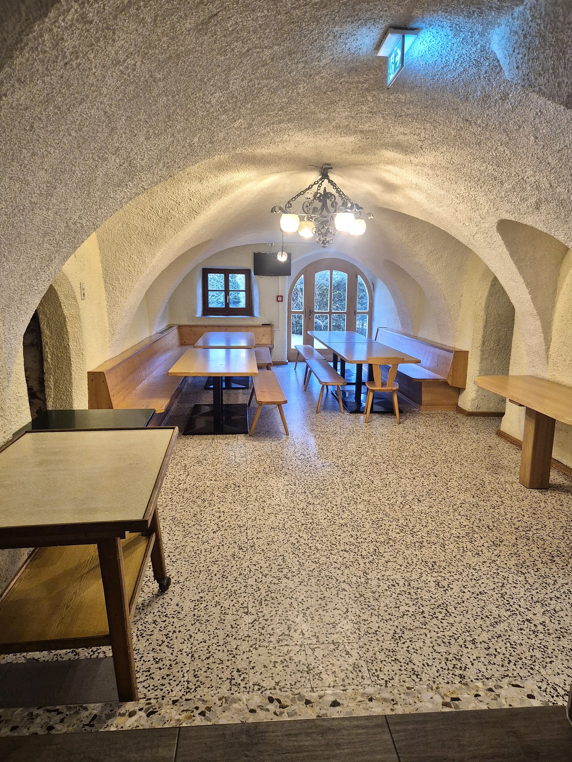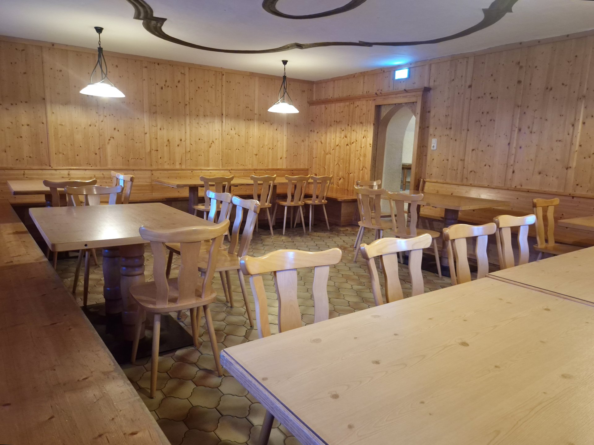 The house's large commercial kitchen is ideally equipped for self-catering groups. Comprehensive kitchen equipment and ample cookware and tableware allow for the uncomplicated preparation of meals together.